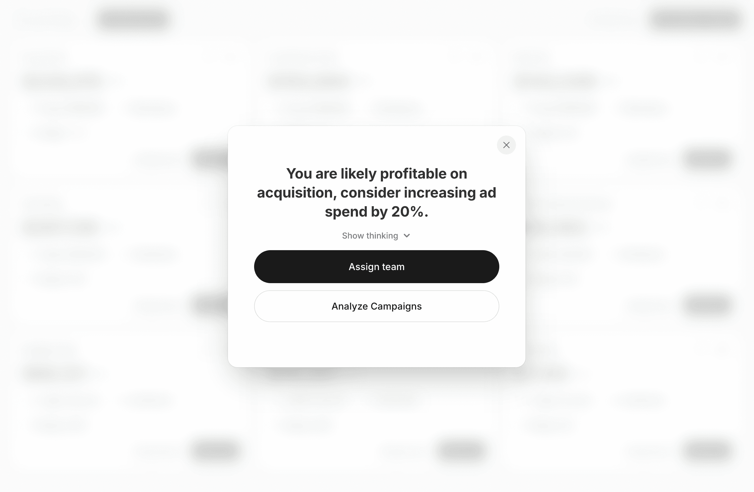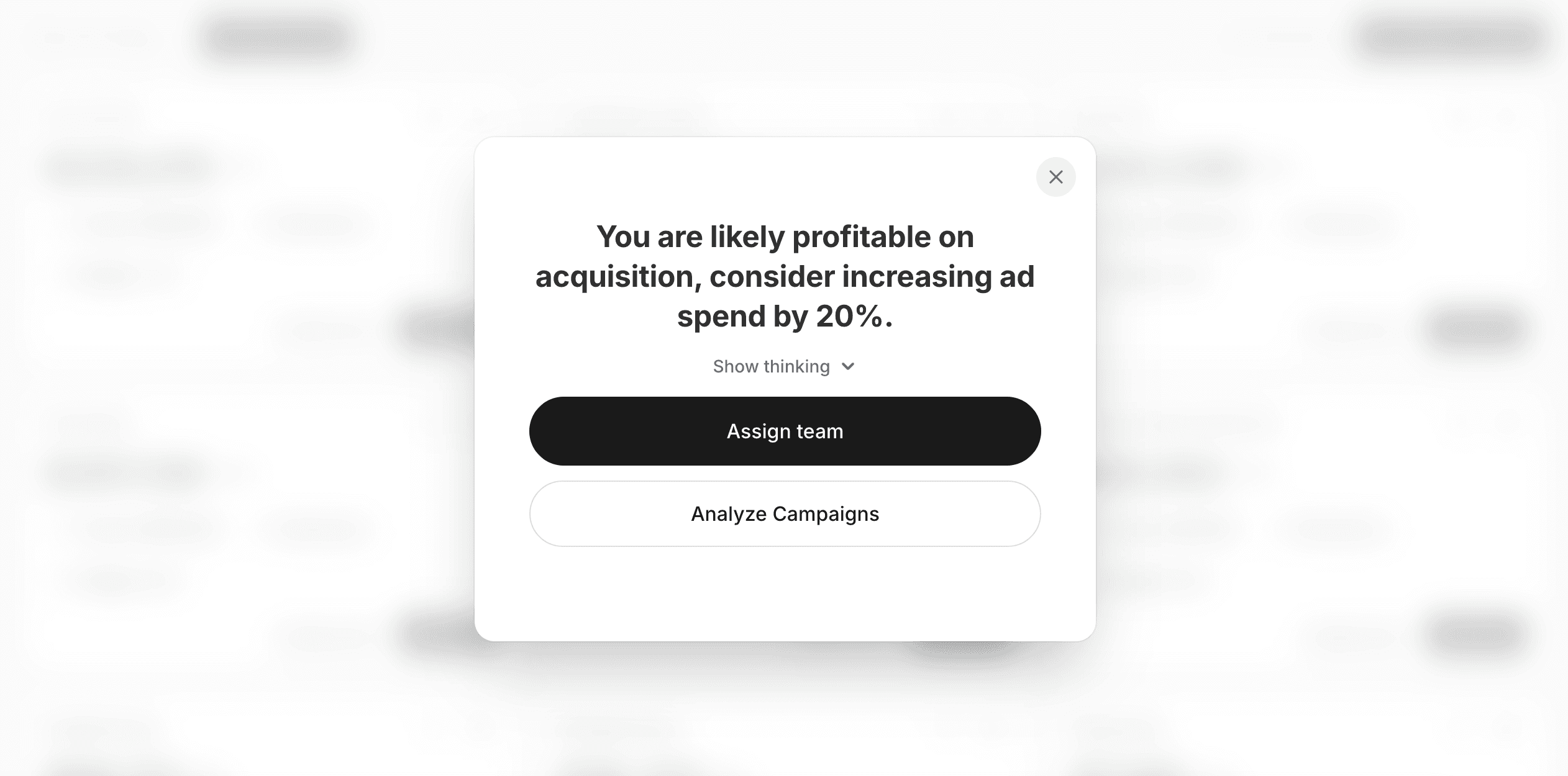Add your own AI model to your Shopify store and ad accounts, get real-time strategy, set targets and assign your team.